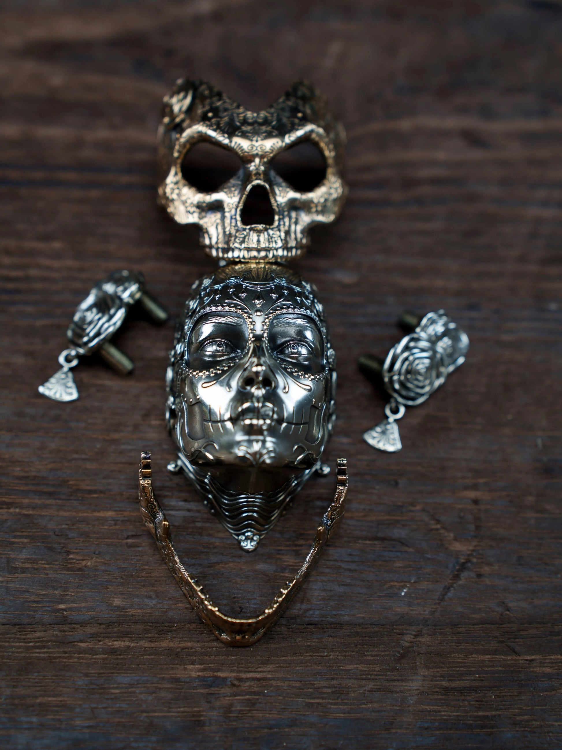 Unleash a bold statement with the Mechanical Rose Skull – an exquisitely crafted EDC toy that blends gothic elegance with industrial precision. Made from high-grade stainless steel and polished bronze alloy, this piece features a half-mechanical, half-organic skull design wrapped in intricately detailed metalwork. Highlighted by sculpted roses, gear engravings, and symbolic charms, it's not just a fidget toy—it's a wearable piece of dark art.